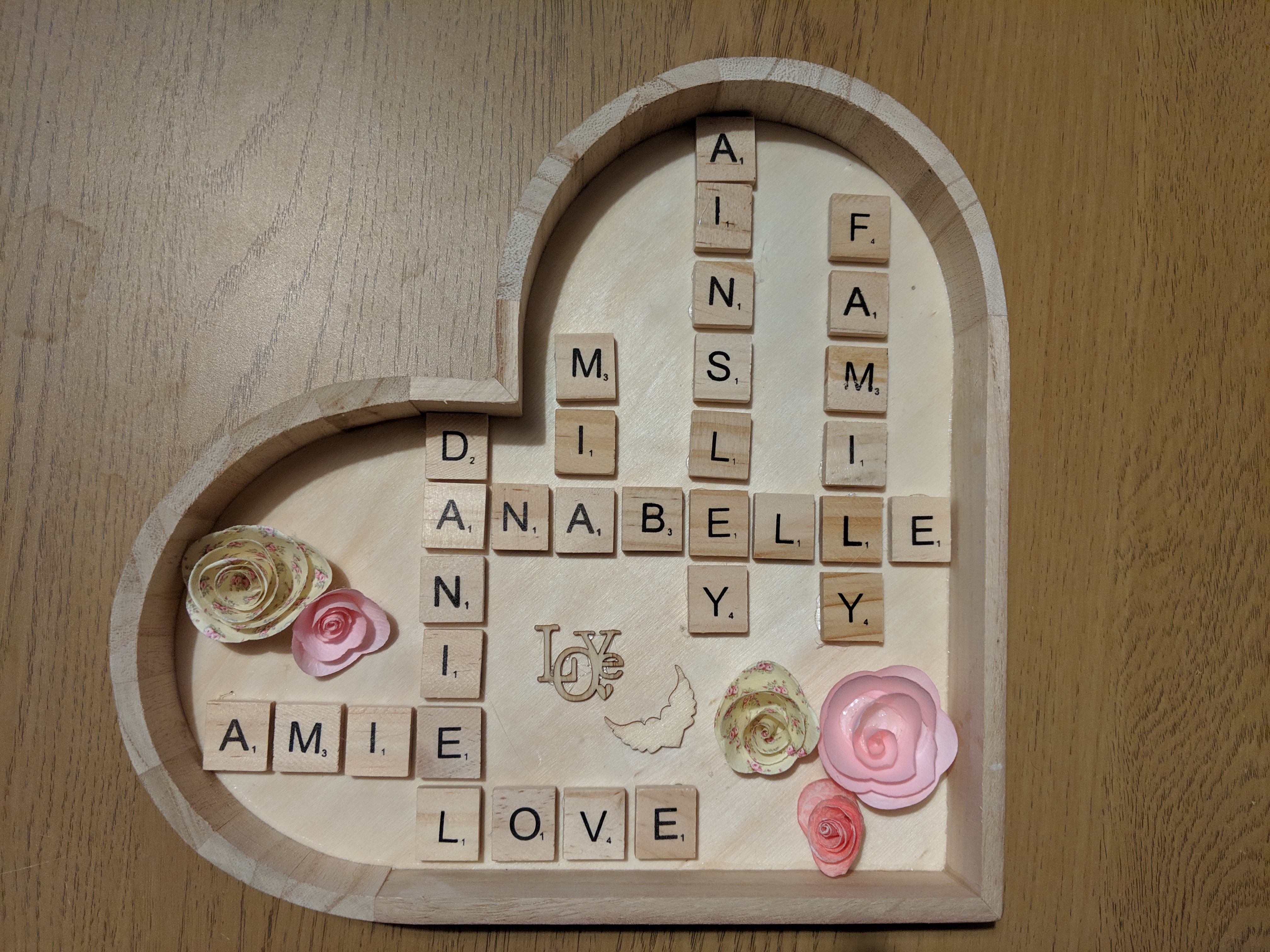 Interchangeable photo with heart decortaions attached. Hand written names or messages on the hearts or can be wood burned on for extra effect. Great for special occasions.