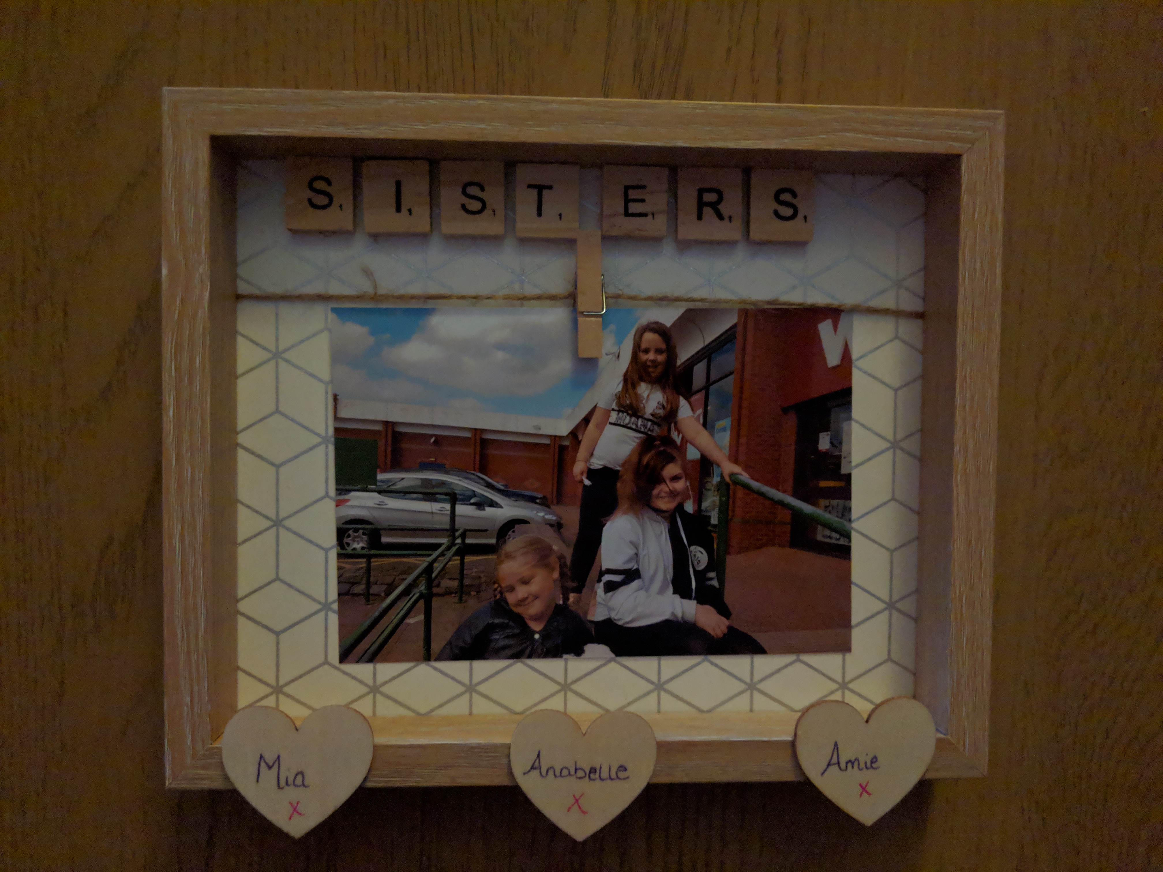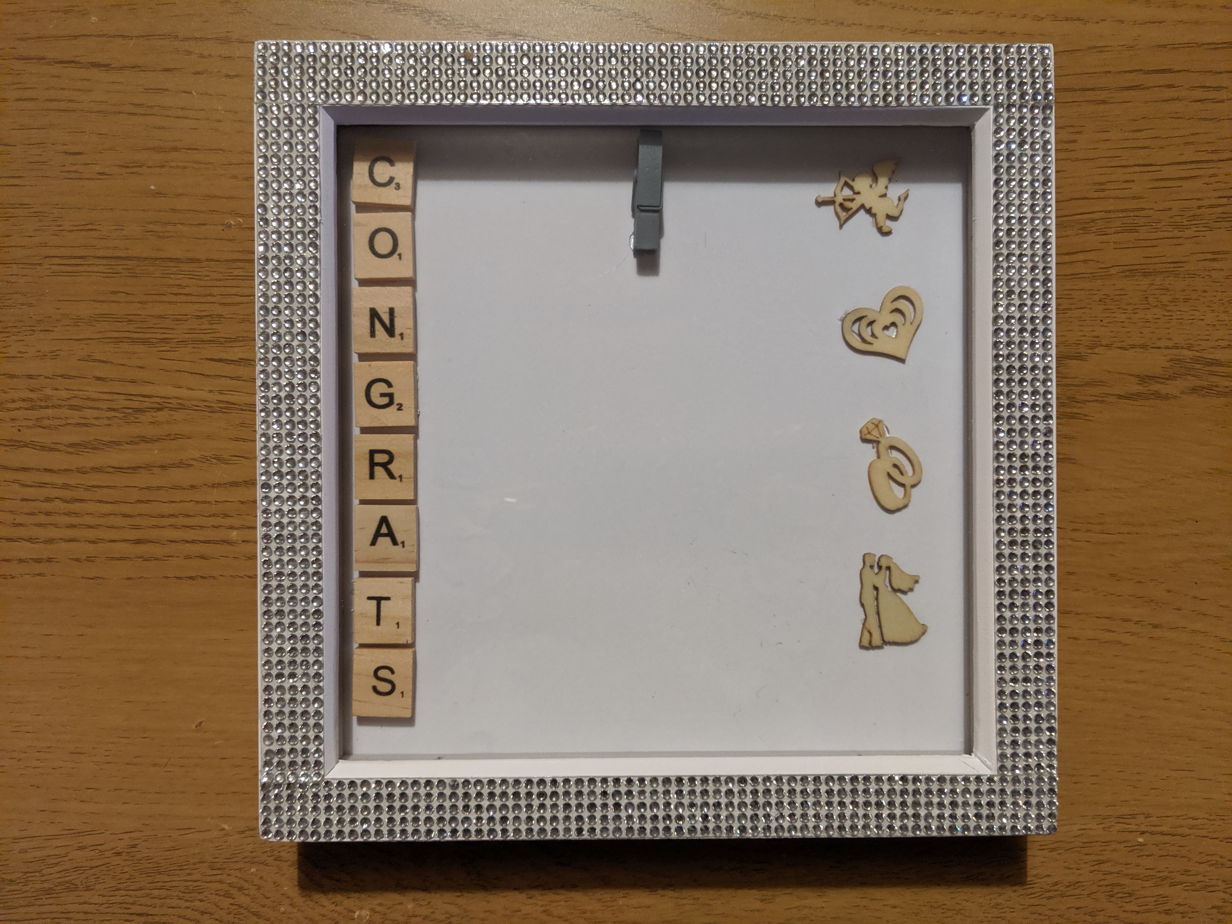 Gorgeous frame with rind stone decoration arouind and customised text. Photos can be easliy changed via a peg inside.